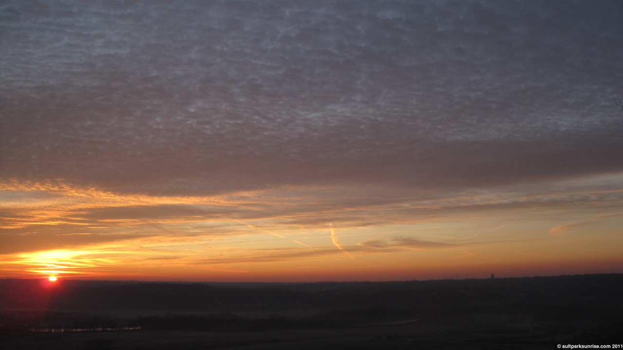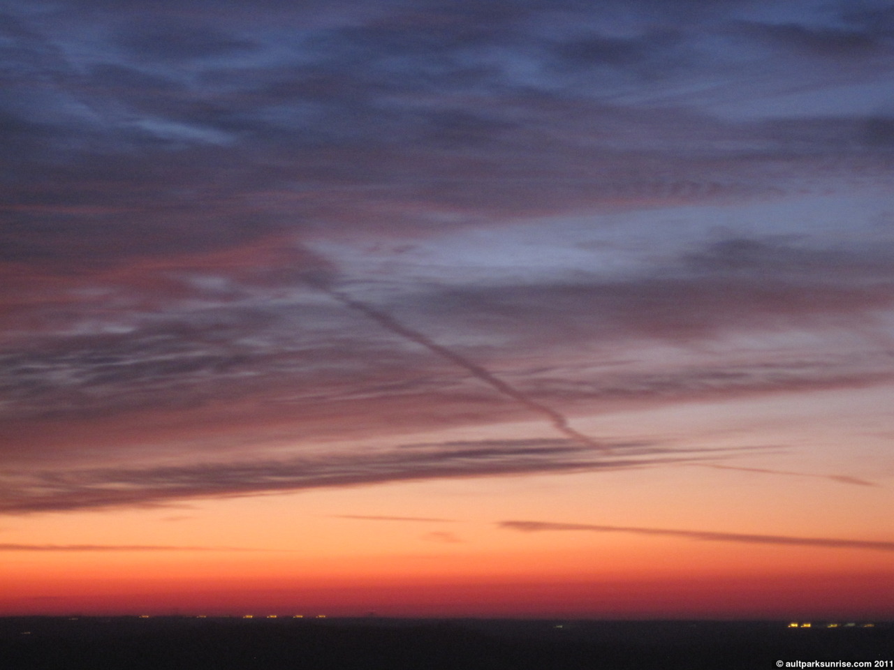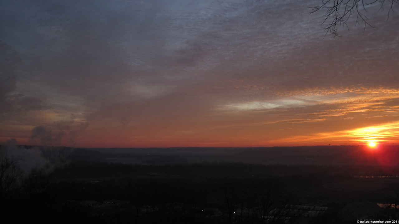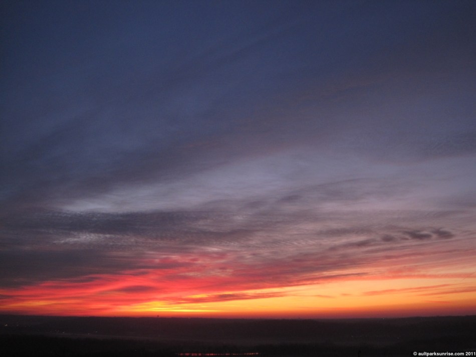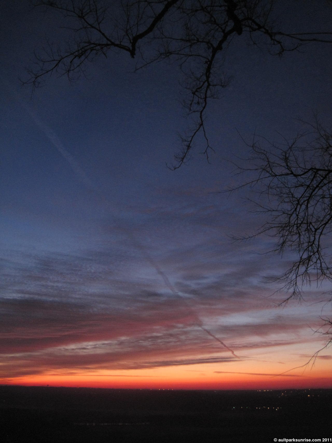 It was quite amazing to watch the transformation of the sky from a deep dark black into the colorful display of the twilight atmosphere. In fact, when I left the apartment it was so dark that not only could I see the stars, but I had no way of knowing that on the other side of the hill the twilight show had already started. I was planning on getting set up at the park by 7:00am (65 minutes before sunrise) and having nothing to do for about 45 minutes. I could not have arrived at the park at a better time. At 7:00am the low horizon had already taken on a deep red mohogany that was compact and restricted to the region of the sky just above the ridge line. The clouds were just beginning to take on a dark shadowy navy purple. It was still dark enough that the street lamps cast long shadows across the lawn while the sky began to change in the background. This was by far the earliest sunrise I’ve ever witnessed and really changed my perspective on “how soon” one should expect to show up for a clear sky sunrise if they wish to witness the entire ordeal.