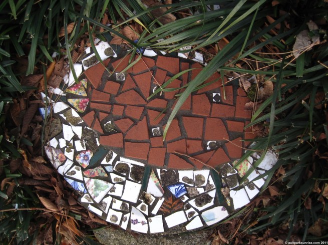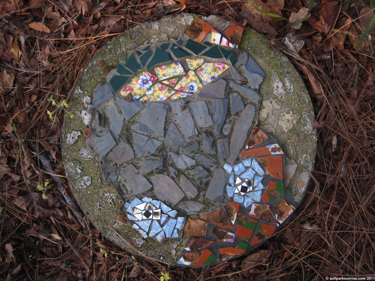 My favorite thing about winter is that with the foliage gone there all sorts of neat little things that a watchful eye picks up. Here we have some stepping stones hidden along one paths in the back of the rose garden. Several pieces have fallen off but it still is in decent shape. Is it a face? A vase? A place?