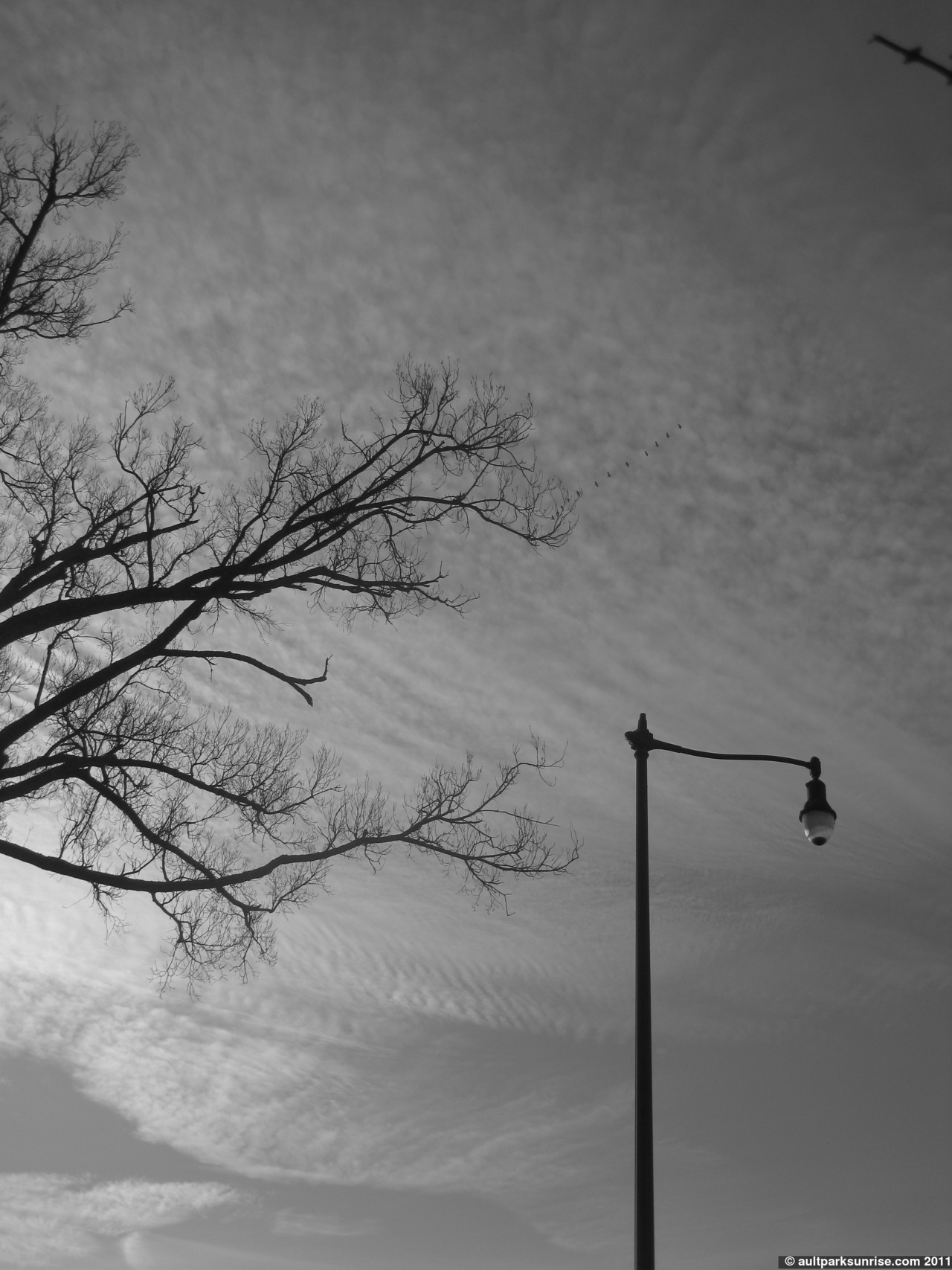 Continuing my search for tree candidates I snake along the back side of the park, down Observatory road towards the Cincinnati Observatory. There is a nice hill with a lawn over here and I realize that there should be some great opportunities to find a tree that I would have an uphill viewpoint of, a perfect angle for a twilight tree silhouette. Ideally it should be by itself so I can capture the entire thing. I look up and see that there is a flock of Canadian Geese. gliding gracefully through the sky. I took the picture a bit too soon, but no matter. It’s at this point that I start to notice that the cloud patterns are taking on interesting form in the sunlight, an almost shadowy effect.
