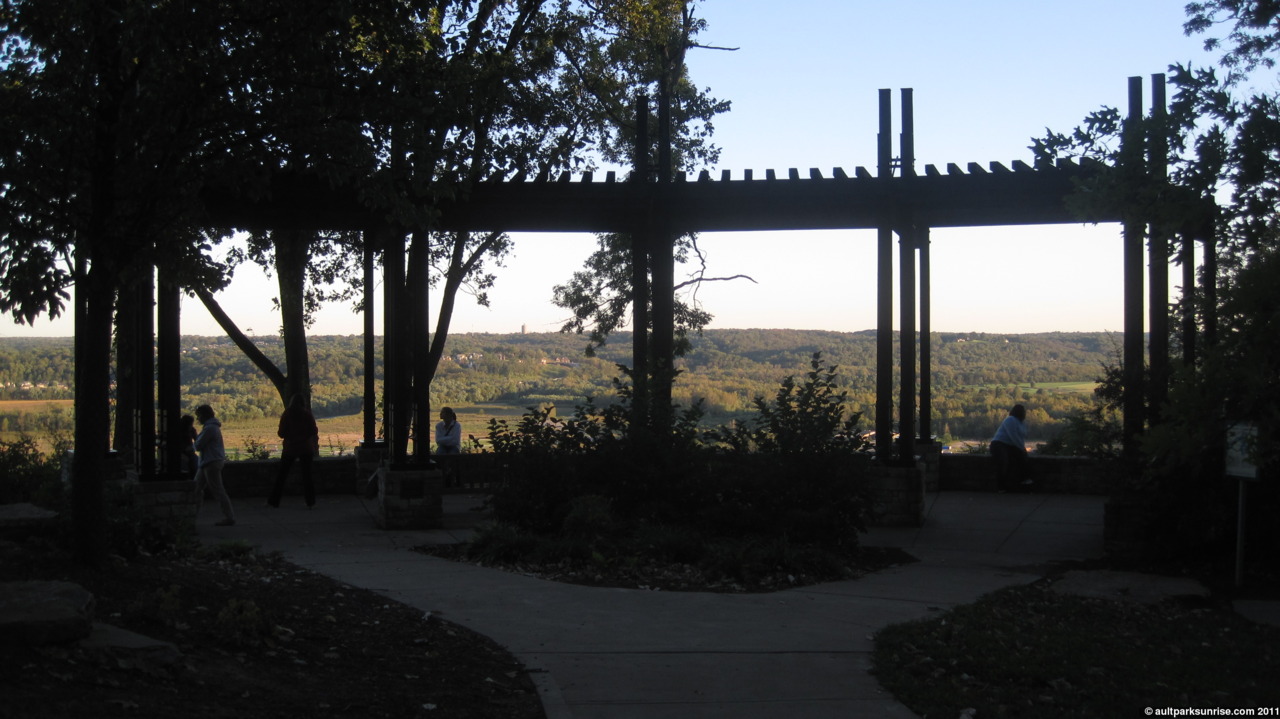 An aligned sunrise behind Ault Park Pavilion