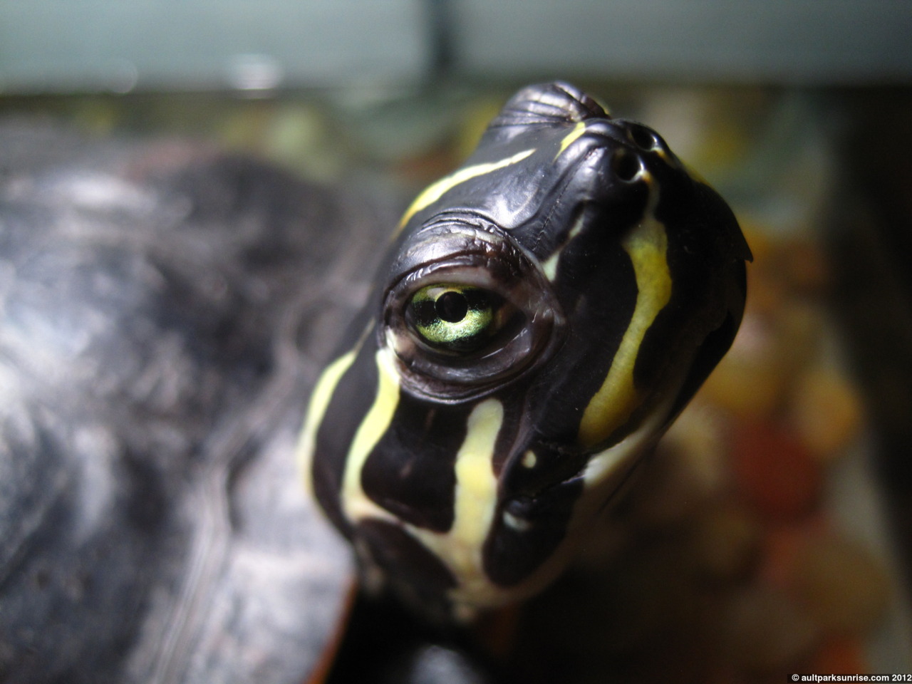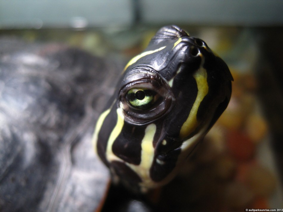 This is Mike the Turtle. His eyes are striped, matching his skin pattern. He loves romaine lettuce, hates iceburg. Likes chasing fish, does not like stawberries (unlike most other turtles who love them). When he’s basking in the sun he gets lethargic, likely giving into the life-giving warmth that only a cold-blooded animal could appreciate.