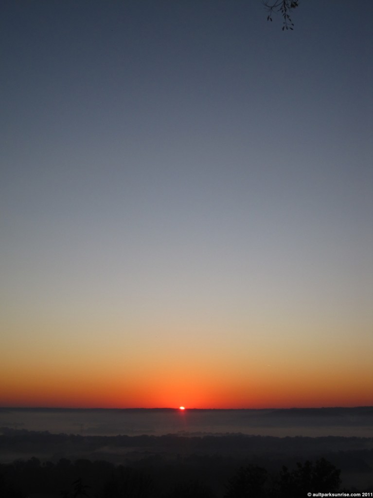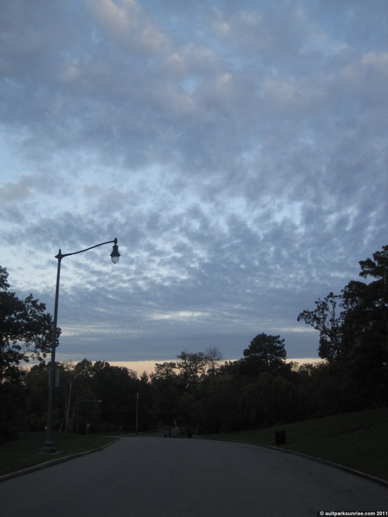 One final thing before I post the few pictures from this morning’s sunrise. I have a new idea for a focus for the remainder of this Autumn’s sunrise posts. As the Cincinnati forests change their coats into their autumn shades, I’m finding myself picking out patterns in the tree-lined background to my morning rides. Just as I observed the various species of trees break out into bloom in a well syncronized seasonal change into spring, I’m noticing the many local species of trees that are changing colors (or even blooming) together while their green brethren hold out until they are ready. I’d like to focus on a specific species of tree for a morning and find all the locations in the neighborhood where this tree has found a home. In the forest, in yards, and placed in the park and the city boulevards by the park service.