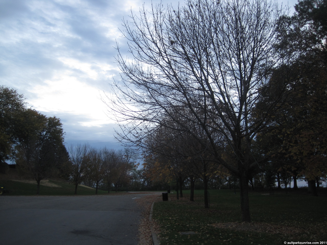 Even though it was darker than ideal in the park, I took the chance to document the pretty Ash trees that line the road by Heekin Overlook. I waited a few days too long and they’re mostly done shedding their leaves, but I realized that at a minimum I needed to get a picture of them because it is possible that they only have a few years of health left in them. I covered the Emerald Ash Borer Beetle a bit in sunrise 102.