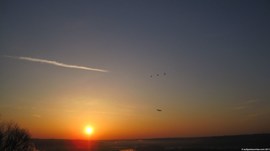 This morning was another beautiful day in Cincinnati. The sunrise was similar to yesterday’s: clear, vibrant, and warm. I arrived at the overlook with 5 minutes to spare, taking time to get set up for the show. Lunken airport was fairly busy this morning, and I actually “accidentally” caught a couple of sunrise pictures with airplanes coming in on approach.