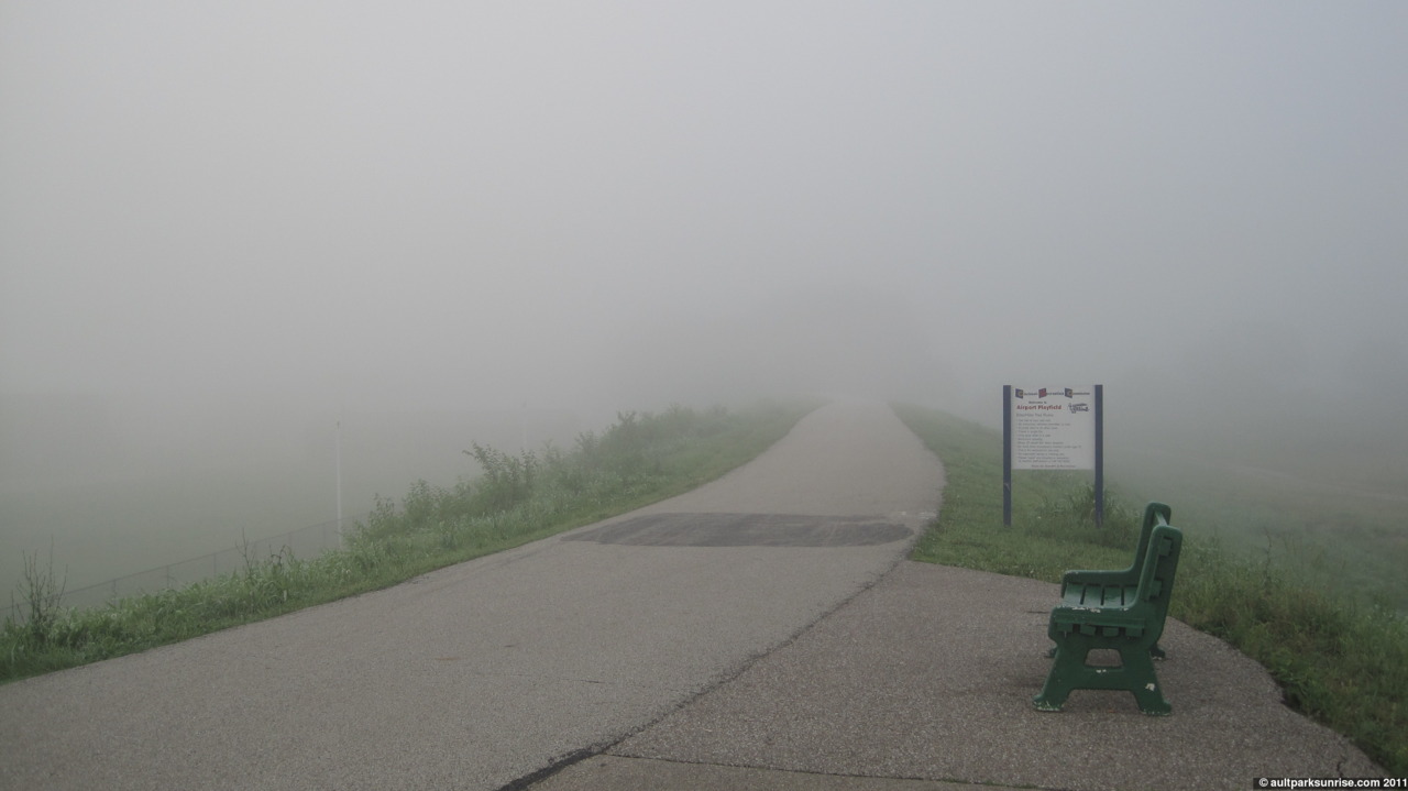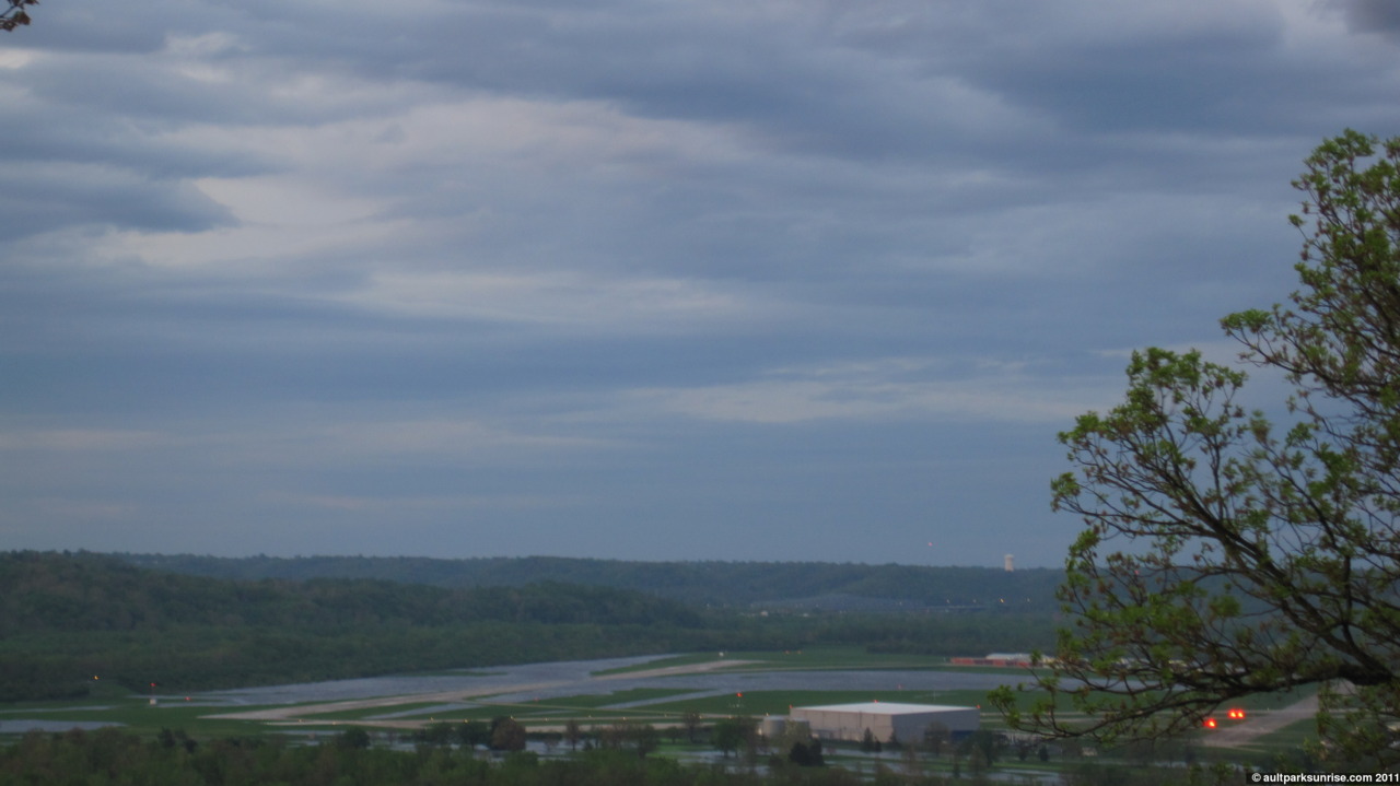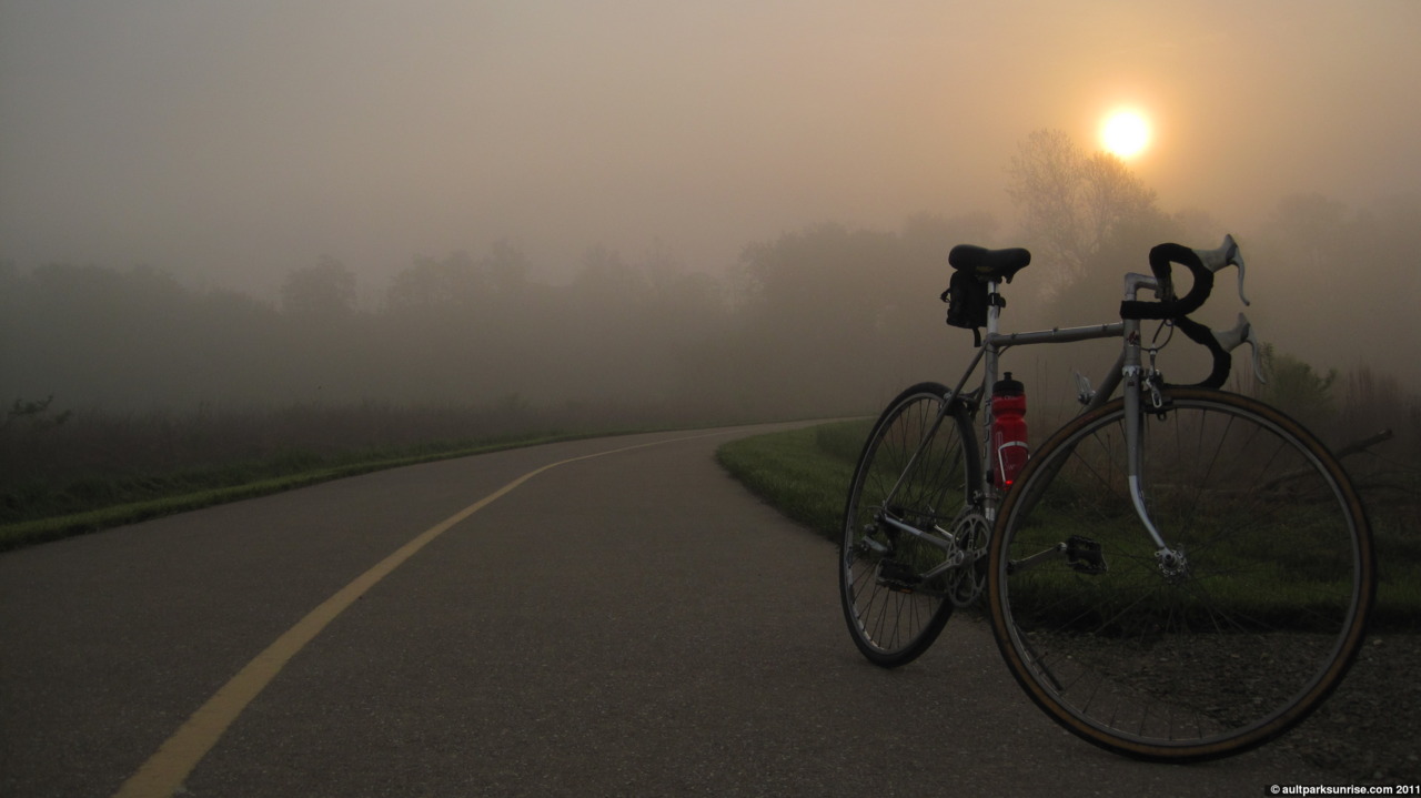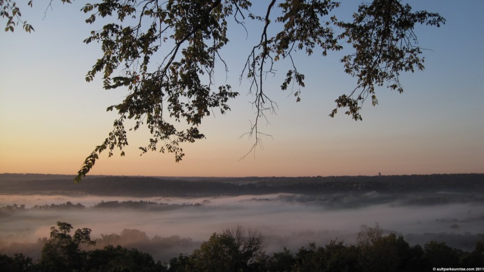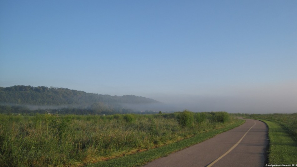 Sunrise 86 was one of the more beautiful summer sunrises of the year. If the ideal sunrise of the spring is a partially cloudy and humid morning full of late-sunrise oranges, the ideal summer sunrise is one of a clear atmosphere with dense fog in the low-lying valley and a bit of a cold bite to the air. This morning’s surnise was exactly that. I had a friend with me this morning, who stayed over to redeem a long-standing offer to join me on a morning sunrise ride. We did a nice loop through the eastern hills. After taking advantage of “free coffee refill Mondays” at the Mt. Lookout UDF, one of my favorite things to do, we cranked it up the hill at about 6:30am, 20 minutes before the sunrise at 6:50am. We started off with the dawn opening and sunrise at the Cincinnati Observatory, then off to Ault Park’s Heekin Overlook for the remainder of the early light. Heekin Overlook had a breath-taking view down into the foggy valley over Armelder Park. We dropped down into Linwood to Armleder Park, checked out the foggy meadow, and then hightailed it over to Lunken Airfield before climbing Mt. Tusculum up past Alms Park.