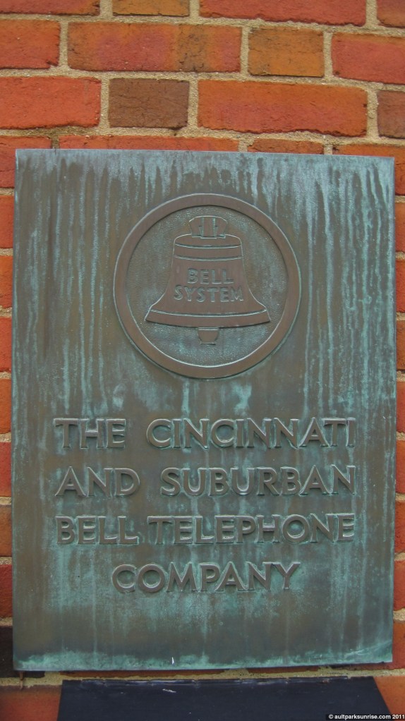 The plaque reads “The Cincinnati and Suburban Bell Telephone Company”. Ahh. An old relic of the Bell / AT&T monopoly. I don’t know much about this history (AT&T alone is interesting), but the local telephone carrier Cincinnati Bell is one of the few fragments left that still uses the “Bell” moniker. The history of Unix is tied into AT&T history as well, of course, which means that your ANDROID phone (running linux) and even the iPhone (which can be traced back to FreeBSD/Unix) can be tied back to the legacy Bell computer systems. All of which are, in a 6-kevin-bacon-degrees-of-freedom kind of way, connected to this building. I bet there are some sexy analog switchboards hidden in the closets of this building. Judging by the brick and “modern” look, I’d place building to have been built sometime in the late 1960s / early 1970s. +/- 15 years, I don’t have anything to compare it to. A little bit more Googling and I find that this logo (seen above in the plaque) dates back to 1964.