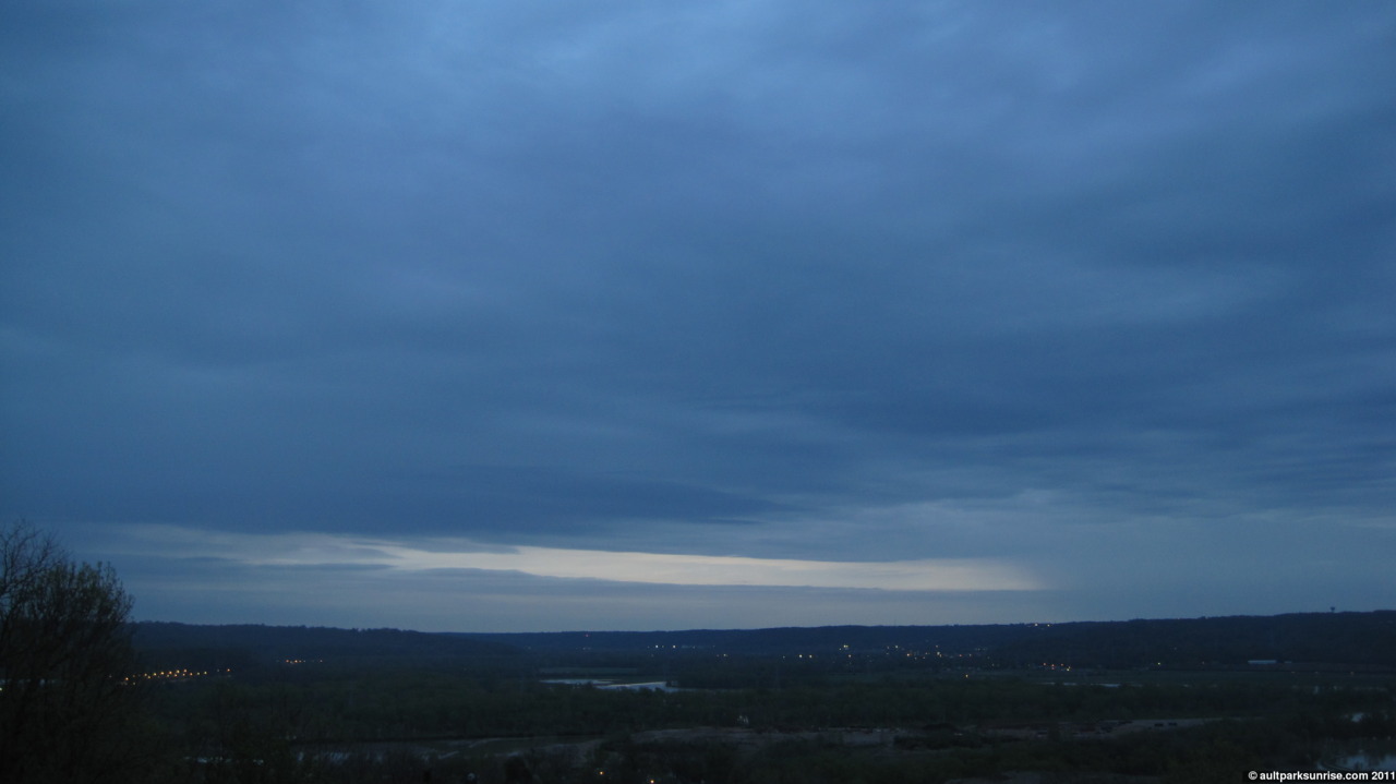 I knew something wasn’t right when I walked into the kitchen. I forgot to make my coffee the night before, so I filled up the kettle and set it on the stove in a sleepy haze. I cracked the window open to get a smell of the morning air and listen to the bird report. The birds were chirping loudly, and I looked up and saw a dark, deep blue sky. Good. Dark and… wait, deep blue? What happened to the gray? I panicked a little bit and walked out side. Sure enough, the sky was almost cloud free, save for what I could see along the horizon behind the trees. Now, because we’re only about 15 minutes before sun rise and the sky is dark, but clear, this can only mean one thing. A clear sky with a low-lying cloud bank sitting on top of the horizon, right? “This could be interesting”, I thought to myself. I checked the time – I should have left 5 minutes ago if I wanted to casually stroll up to the park and arrive with some time to spare. I rationed out the water in the kettle so that I had just enough water to fill my thermos, and gathered up everything I needed for the morning.