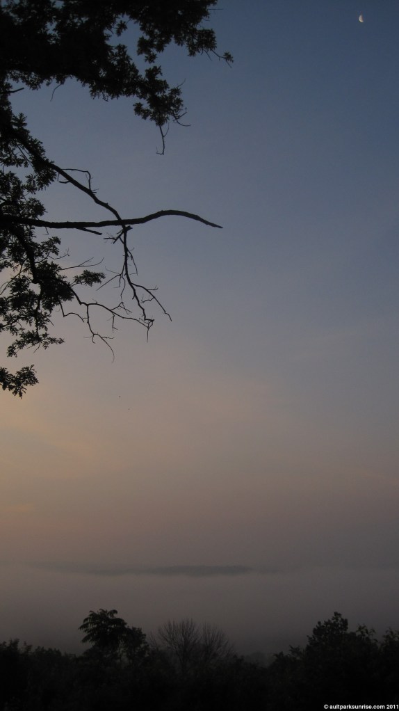 Down in the Little Miami River valley the familiar thick fog was present. But there was an interesting difference this morning over the previous mornings. While the Eastern sky (towards the sunrise) was clear, and the fog was present throughout the entire valley, there was actually a thick low-lying cloud bank to the west. This caused a kind of dark floor to the sky over the lunken to the west.