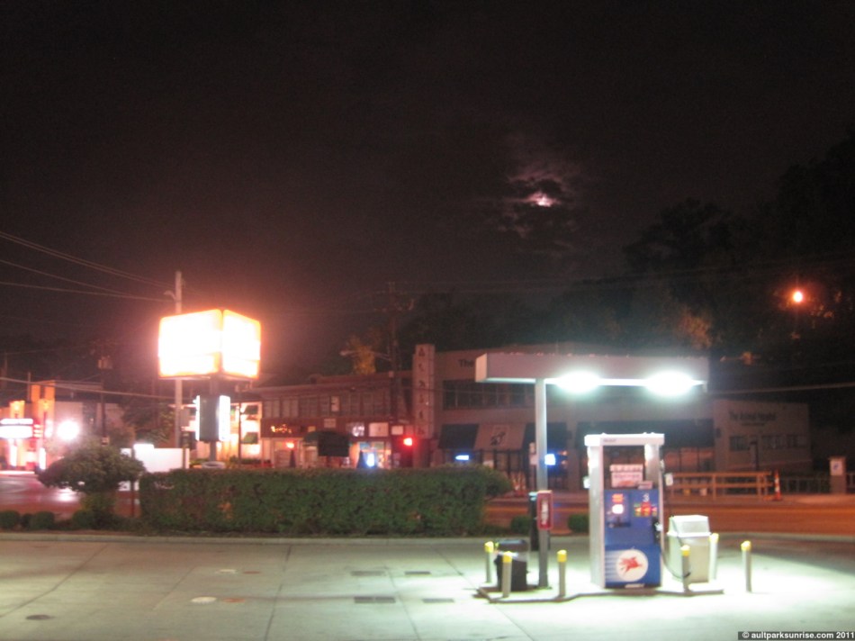 Mt. Lookout and the full moon at 4:55am. Close by there may or may not be some late-night party animals walking back home.