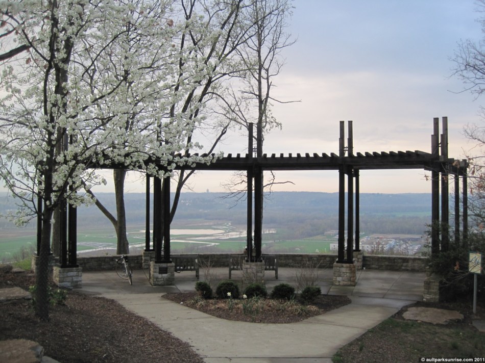 To the right we see the historic deco Mt. Washington Water Tower. Do you know what’s really neat? I read this document from the Cincinnati Parks on how this area used to be as flat as the rest of Ohio. About 40,000 years ago the glaciers melted and the Ohio and Little Miami Rivers were born. The thing that makes Cincinnati’s geography so neat is that all of the peaks of the controversial “Seven Hills” (or as the document put it: the Seven Valleys) are at almost exactly the same elevation. I’ve come to know this personally as I bike around for this project between many local parks. There are several parks that I wasn’t even aware of until now. The parks that all live at the peak elevations of various hills are: Ault Park, Alms Park (forgot about that spectacular picture of thunder heads), Larz Anderson Park, Eden Park, Devou Park, Bellevue Hill Park, Fairview Park, Mt. Echo Park, French Park (no overlook), Drake Park (looks like there are no quality pictures of the view from this park – it’s on the way to my work so I’ll have to stop by some morning for sunrise), and probably a few others. (By the way have you picked up on it, yet? Cincinnati Park Board is amazing).