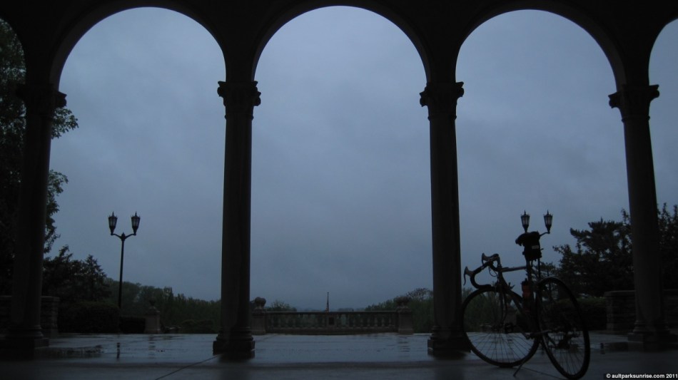 This lead to an interesting dilemma this morning. My bike is now pedal-less (bike shop was closed on Sunday), so I borrowed the wife’s bike for the trip up to Ault Park. She did just fine, although because it isn’t a road bike, going up the hill was slow. I’d say it was painful, but that might just be because of the bruises! In the end, I am definitely glad I was able to muster up the motivation to see the sunrise. Although I never actually saw sun due to the cloud cover, the view was beautiful. This was the warmest morning yet, it was downright pleasant out.