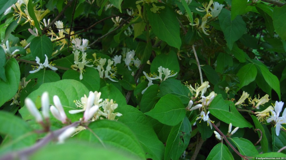 This green bush is down by the overlook. I took a few pictures of it earlier last week when the buds were still small and green. It has started blooming its small white flowers.