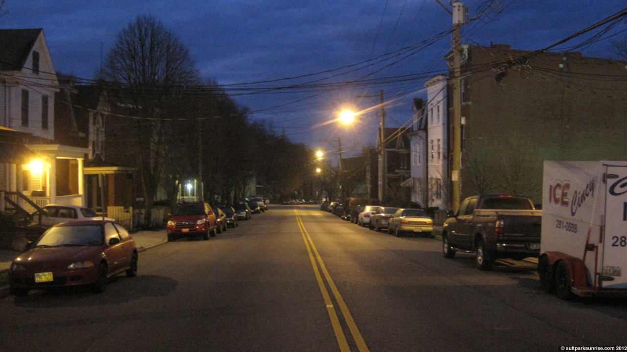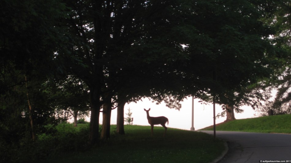 I left my apartment this morning with the feeling of wanderlust. With the scorching heat of the past few days, it was downright refreshing to be out in the cool morning air. During the past few sunrises I noticed that the sun was creeping far to the left of the overlook and the first rays of light after the sun crests over the horizon are obscured by trees. I believe this won’t get any better until the second week of June (holy crap thats coming up) when the sunrise time bottoms out at 6:11am for several days. I imagine that the sun will maintain its position until the sunrise time starts to advance further in the morning. Until that time, however, I have to wait a bit to get a good “head-on” picture of the sun in the morning sky. Knowing this, I made a quick decision to ditch the left hand turn that would take me to Ault Park and instead took the right hand turn to Alms Park. I found out a few days ago that Alms Park has a more unobstructed view of these left sunrises. The idea of going to Alms Park – while more difficult both because it is a longer distance and has several steep climbs – seemed to resonate with me now that the officially 40 days of Ault Park have been accomplished. These “post-40” days are about exploring the future direction of the sunrise project. So off to Alms Park I go!