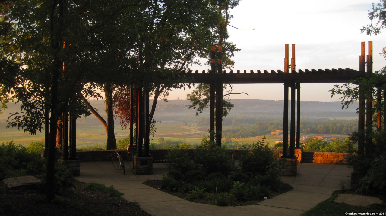 An aligned sunrise behind Ault Park Pavilion