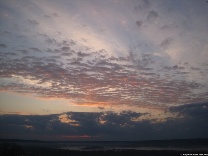 As I left our apartment I looked up into the sky and saw mostly overcast clouds. But there were spots light where the layer was thin, exposing the dark blue morning atmosphere. I took my time getting to the park, figuring that the sun would be non-existent this morning, but was pleasantly surprised to see that just above the horizon there was a familiar break in the clouds. The sun shone through the open sky for a few minutes after sunrise, casting a moving shadow across the cloud ceiling. The sun was a bright orange but the light was quickly absorbed by the patchy sky.