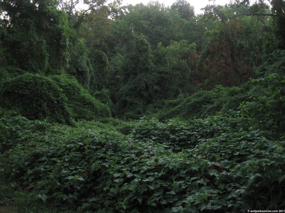 It may seem that the kudzu is left free to roam through Alms Park, but now that I think about it, I have never noticed it in Ault Park. Although this also goes back and points to my theory of Ault Park and Alms Park’s Yin/Yang relationship. I’m talking about how Ault Park is manicured, designed, symmetrical, with planned gardens and lots of flowers, with the forest pushed to the edge of the park, while Alms Park is more organic, where the forest seems to be all around you. There are small flower gardens in Alms Park but they’re not the focus as they are in Ault Park. Alms Park is more quiet and has some of the most majestic oak and pine trees that I’ve ever seen. So could it be that the Kudzu is simply left to grow in Alms Park? I imagine it is a lot of work, anyway, to remove such a quickly growing and invasive plant. I’ll have to ask the park service guys about what they think of the Kudzu.