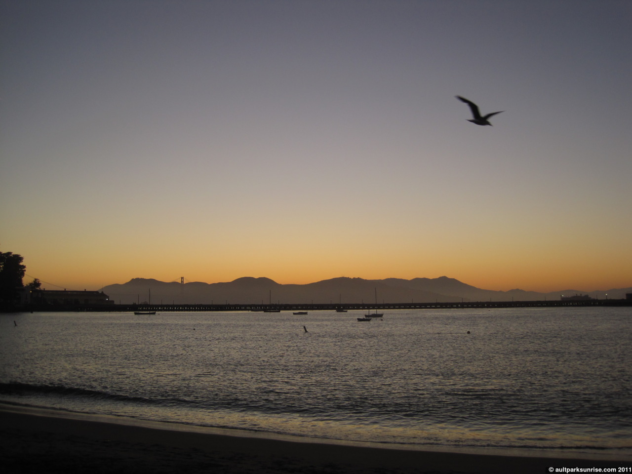 The sun has slipped behind the mountains. You can see the Golden Gate Bridge, just barely, on the left in the distance