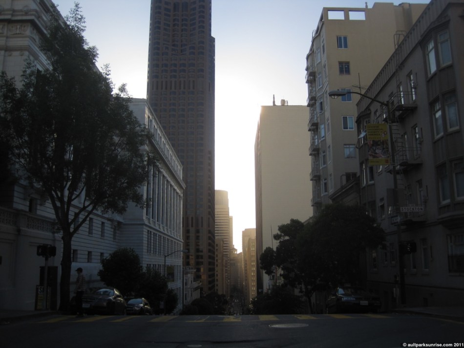 We’re staying in a neighborhood in San Francisco called Nob Hill. This morning my alarm didn’t go off correctly (I think I actually disabled the alarm with my face because I slept with my phone under my pillow) so I woke up right at sunrise (5:45am local time). In San Francisco (and any big dense city), as a local girl told us: “We don’t have yards, we have roofs”. There is roof access on the small 4-story bed and breakfast that we’re staying in so I headed up to the top of the building to see what the sunrise looked like. It was indeed a pretty sunrise, but unfortunately the taller buildings close to the bay eclipsed the direct view of the sun. Not satisfied with a simple silhouette, I decided to venture out in to the city by myself to see what I could find.