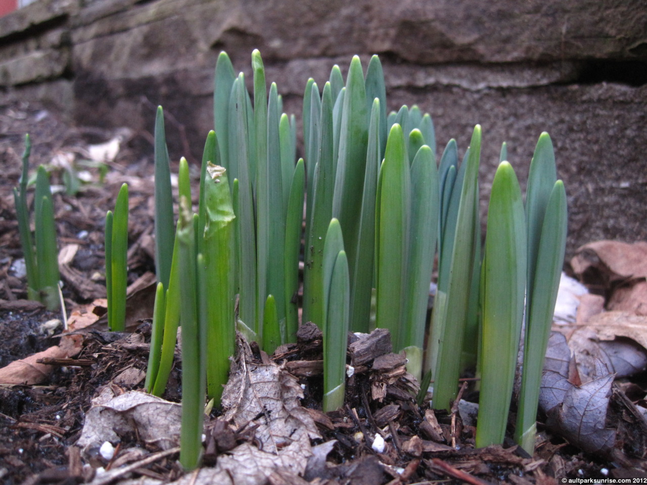 Some crocuses (or tulips?) coming up through the mulch out in front of our place. They’re a bit early (at least a month, maybe two); hopefully they don’t get killed by the next hard freeze!
