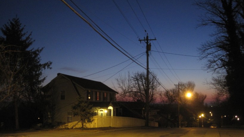 Arriving in the park, I am surprised to find that the sky is not dark at all. Early twilight colors abound. On the left side of the frame we can see the light from a lit street lamp illuminating the lawn.