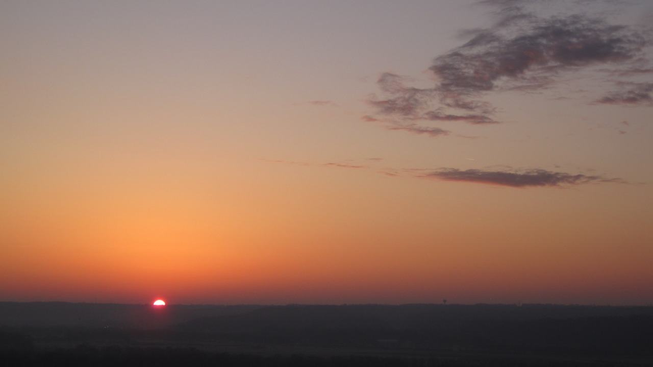 A close-up of the sun rising over the Little Miami River Valley. Note the deeper reds and purples still in the sky just above the horizon, as if the sunlight can’t penetrate very far into the atmosphere. Compare this to a similar picture of a less humid sunrise.