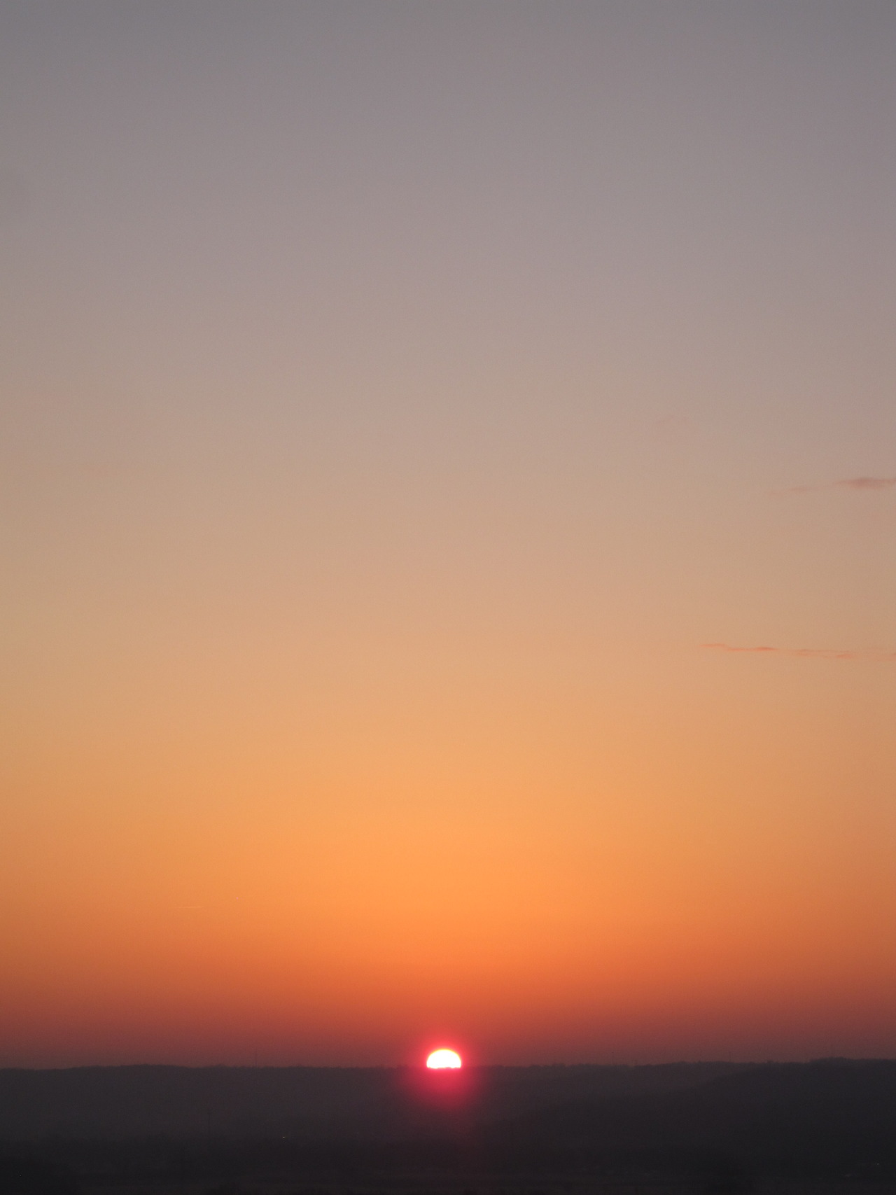 So this morning I decided to get up earlier than usual since the forecast had me getting excited over the possibility of clear skies. I arrived at the overlook by 7:20am, a full 28 minutes before sunrise. I was surprised to find that the ambient light was already bright enough where I had no trouble seeing with the naked eye. In fact, I could have arrived 20 minutes earlier and still had plenty of atmospheric color shifting to watch. As I look at the sunrise calendar, I see that “Civil Twilight” started at 7:14am. I am coming to realize that this is probably a good indicator of when one should attempt to “show up” to observe the full evolution of a clear sky sunrise. Today’s sunrise was actually quite humid, evident by the “red globe” effect that the sun appeared with, rather than the “bright blinding yellow light” effect that a dry sunrise with clear skies would produce. I would even venture to say that the Nautical Twilight time of 6:41am would have been an appropriate time to show up this morning. Heck, on a completely dry day where the first light would penetrate deep into the atmosphere, the Astronomical Twilight time of 6:08am would not be a bad idea, although that would take some serious commitment.