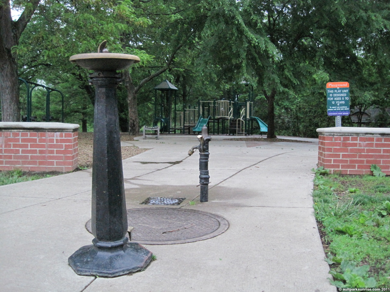 Next to the playground that the conifers tower over there are two more Murdock Fountains. This is the fourth fountain in the park, the third made by Murdock. It is identical to the style typically found from the 1960s era (Thanks Bob Murdock!)