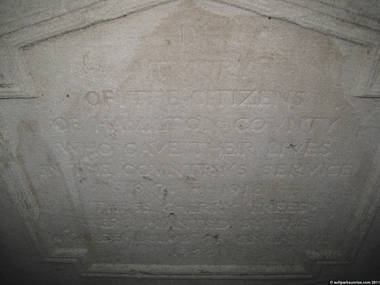 The caption reads: “In memory of the citizens of Hamilton County who gave their lives in the country’s service 1917 – 1918 | These cherry trees were planted by the Garden Club of Cincinnati 1920”