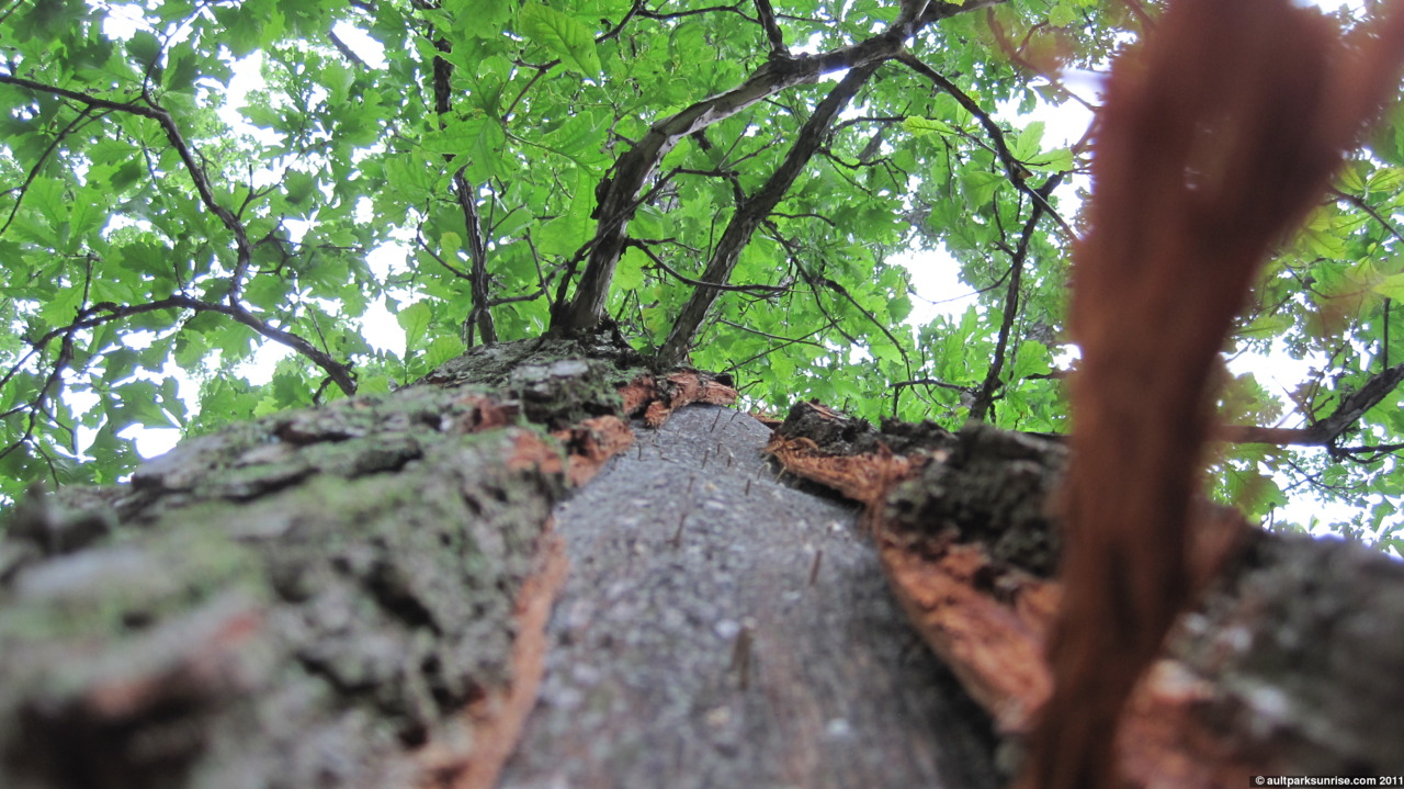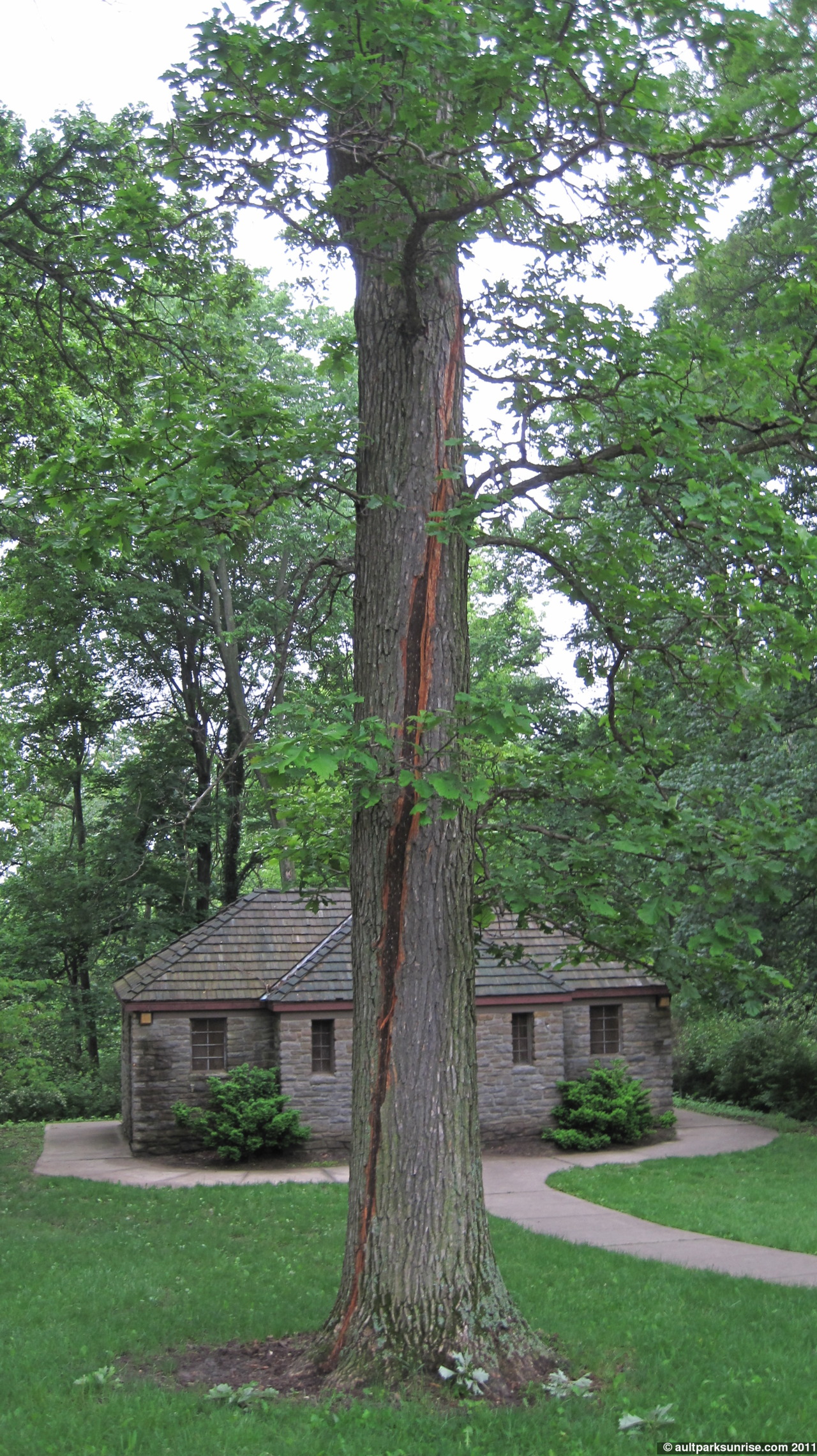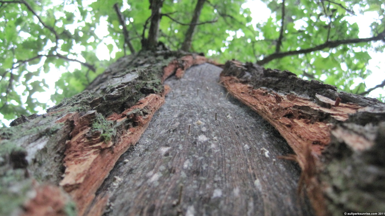 As I am walking away from the overlook, preparing to take my final stroll around the park, something catches my eye. I pass by this tree by the overlook (and the stone restroom building behind it) every morning. I would think that I would have noticed the large chunk of missing bark streaking down the trunk. I believe that this is a typical side effect of a tree being struck by lightning. The tree is still living, fortunately, and seems to be doing fine. Ideally the lightning would have struck the tree and traveled down the trunk on the outside of the tree, stripping the tree of its bark but saving the heart of the tree from destruction. I lost the streak partway up the tree so I’m not sure how high up it goes.