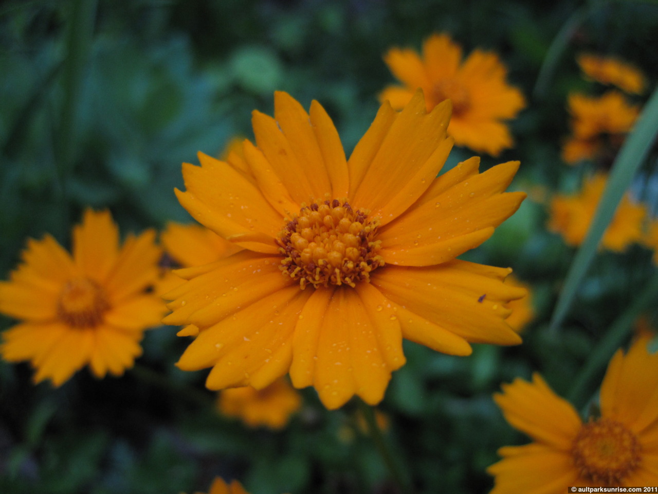 Orange flower with rain drops that just started to collect as the spring shower started overhead.